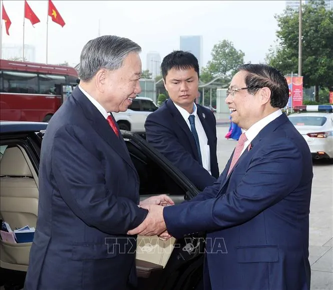 Thủ tướng Phạm Minh Chính đón Tổng Bí thư Tô Lâm đến dự đại hội. Ảnh: TTXVN
